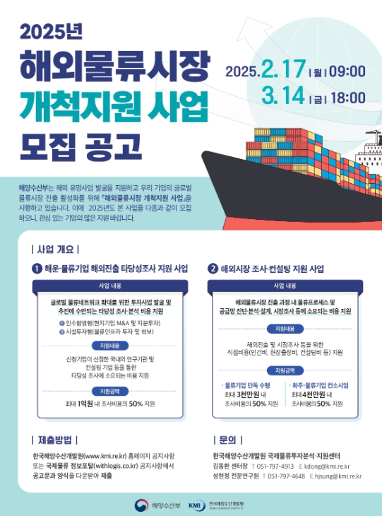 [뉴스서울] 해양수산부는 2월 17일부터 3월 14일까지 '2025 해외물류시장 개척지원 사업'지원대상기업을 모집한다고 밝혔다.