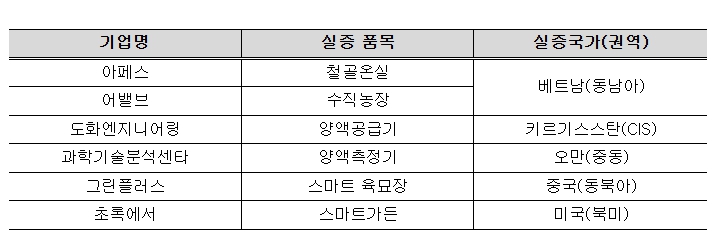 특히 상대 바이어와 업무협약(MOU)을 체결했거나 구매의향서(LOI)를 수령하는 등 수출 논의가 진전됐으나 아직 최종 계약을 체결하지 못한 기업들을 대상으로 선발하여 성과 창출 가능성을 높였다. 선발된 기업들은 최대 8천만원(국비 기준) 내에서 현지에 소규모 스마트팜 시설 및 자재를 설치, 실제 작물 재배 성과를 증명하여 동남아·중동·독립국가연합(CIS) 등 기존 중점시장과 함께 북미·중국 등 스마트팜 신시장 진출에도 박차를 가할 예정이다.