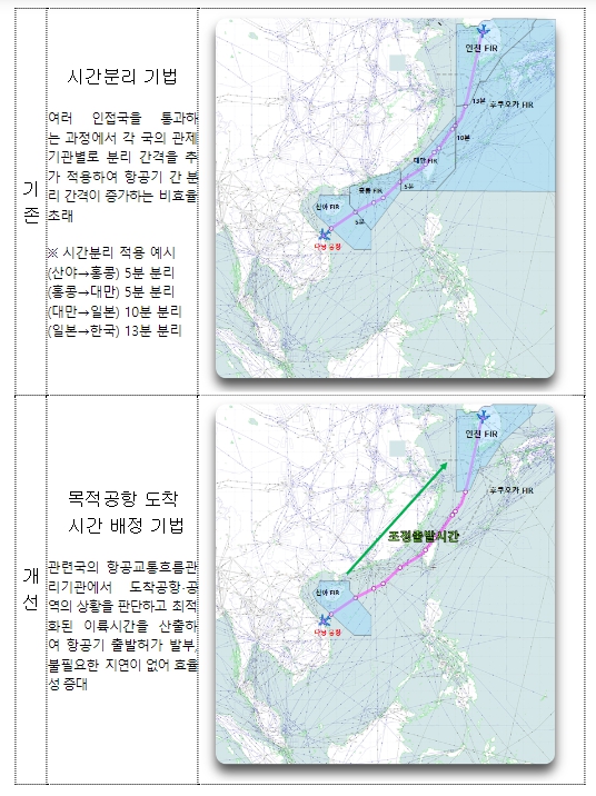 그간, 우리나라는 동남아로 향하는 항공편에 대해서는 일본, 대만 등 인접국이 정해준 출발시간 간격을 항공기에 일률적으로 적용했다. 이에 따라, 동일 시간대 동남아로 출발하는 항공편의 공항 대기 시간이 길어지면서 항공사와 여행객이 큰 불편을 겪는 사례가 빈번히 발생했다.