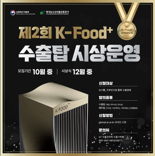 [뉴스서울] 농림축산식품부는 '제2회 케이푸드 플러스(K-Food+) 수출탑'을 올해 12월에 시상할 계획이라고 밝혔다.