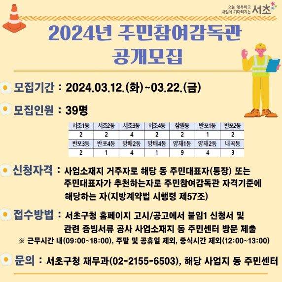 [뉴스서울] 서울 서초구가 동네 공사 현장에 대표로 참여해 진행 과정을 감독할 ‘주민참여감독관’ 39명을 오는 22일까지 모집한다고 밝혔다.