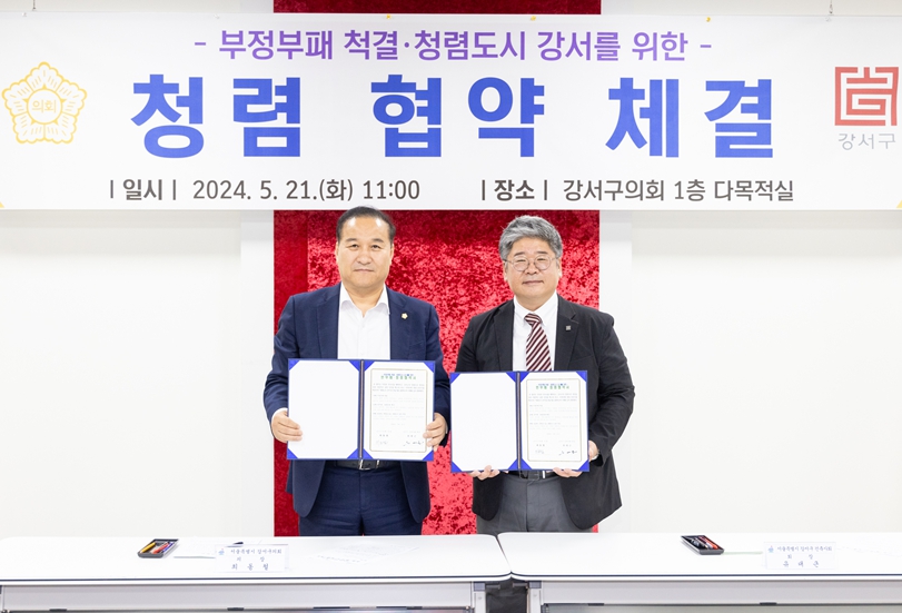 [뉴스서울] 서울특별시 강서구의회는 5월 21일 화요일 11시 강서구의회 1층 다목적실에서 강서구 건축사회(회장 유대근)와 ‘부정부패 척결·청렴도시 강서를 위한 청렴 협약’을 체결했다.