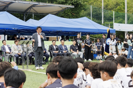 ▲ 박강수 마포구청장이 제2회 마포구청장배 유소년 축구대회에 참석해 선수들에게 격려의 말을 전하고 있다. |