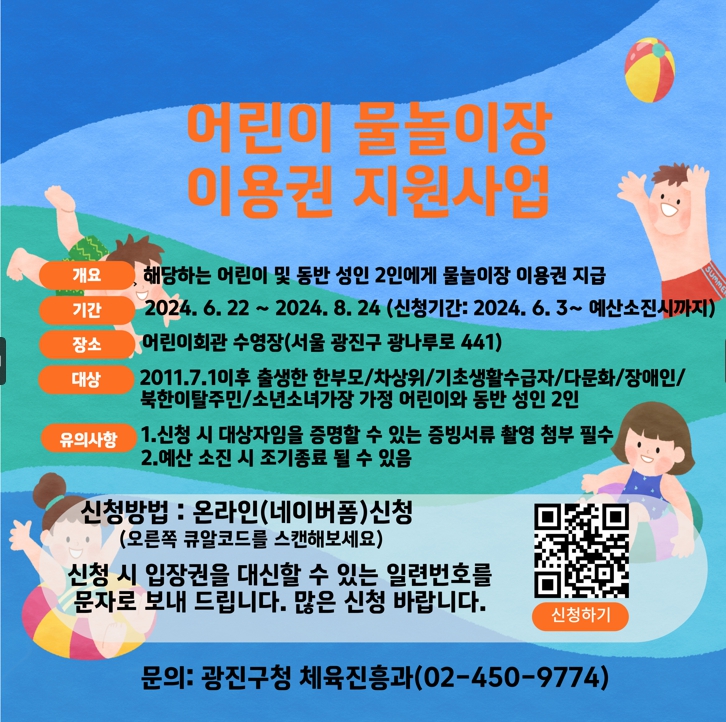 김경호 광진구청장은 “어린이에게 가족과 함께 할 수 있는 여가생활 기회를 제공하고자, 물놀이장 이용권 지원 사업을 마련했다”라며, “앞으로도 소외받는 계층 없이, 구민 모두가 행복하고 건강한 광진구를 만드는 데 최선을 다하겠다”라고 말했다.