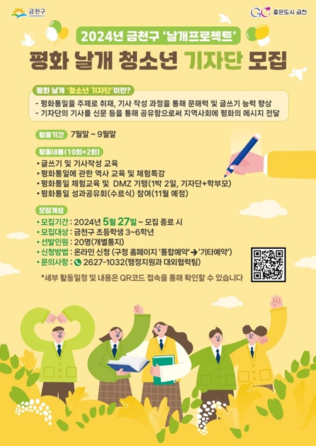 [뉴스서울] 금천구는 지역 주도형 평화통일 교육 사업 ‘날개 프로젝트’에 참여할 청소년을 모집한다고 밝혔다.