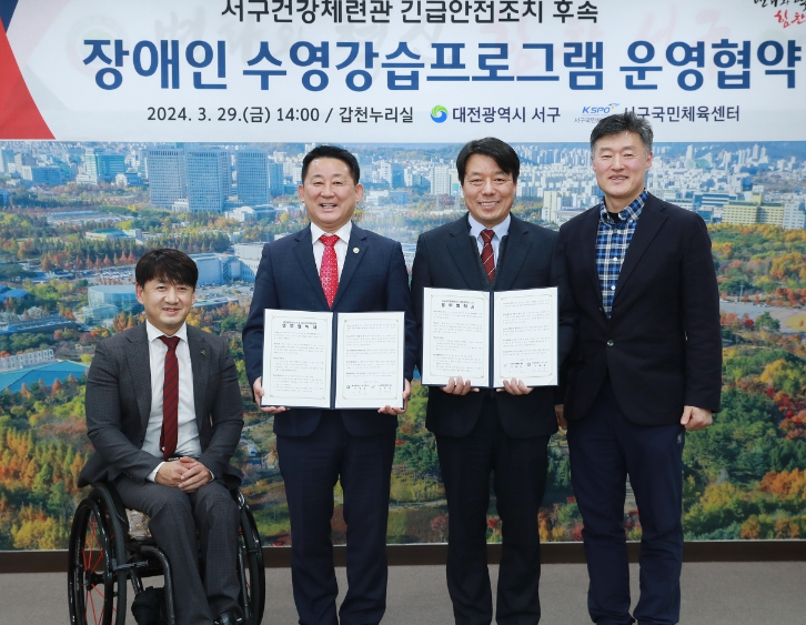 [뉴스서울] 대전 서구는 29일 서구국민체육센터(대표 김대일)와 ‘장애인 수영강습프로그램 운영’ 업무 협약식을 개최했다.