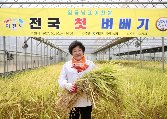 “임금님표이천”쌀의 본 고장 이천시가 후원하고, 이천시 지역농협 주관으로 열린 이날 첫 벼 베기 행사는 연동하우스(면적 900㎡)에 국내 육성품종인 조생종이 심어졌다.
