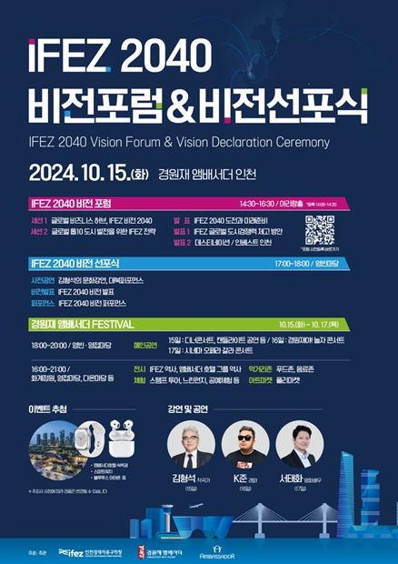 15일 오후 2시 30분부터 경원재 앰배서더 인천 아리랑홀에서 진행되는 IFEZ 2040 비전 포럼은 글로벌 톱10 도시를 향한 인천경제청의 도전을 주제로 IFEZ 2040 비전과 전략을 공유하는 자리이다. 인천시 초일류도시기획관을 지낸 한상을 인하대 건축공학과 명예교수가 좌장을 맡는다.