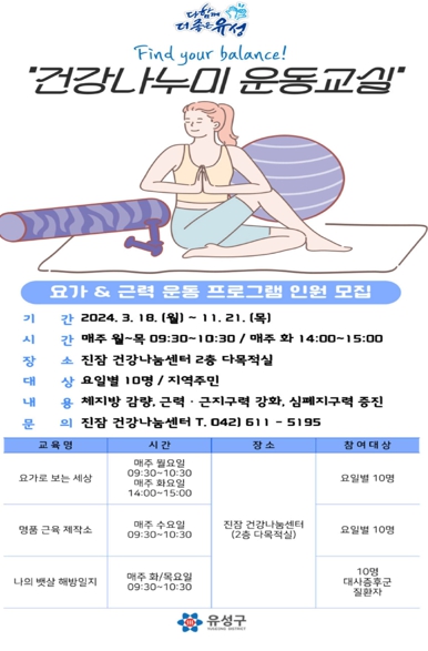 [뉴스서울] 대전 유성구는 오는 3월 18일부터 11월까지 주민 맞춤형 운동프로그램을 제공해 건강격차를 해소하는 건강나누미 운동교실을 운영한다.