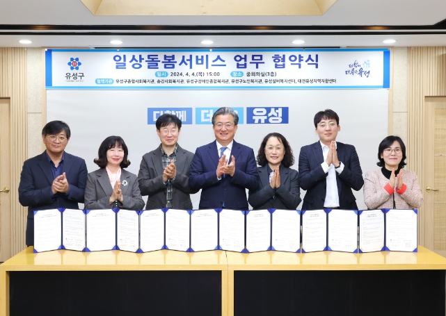 [뉴스서울] 대전 유성구는 4일 ‘일상돌봄서비스’ 운영을 위한 제공기관(유성구 사회복지시설 6개)과의 업무 협약식을 개최했다.