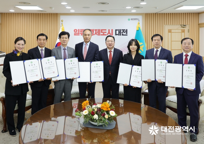 | ▲ 왼쪽부터 박미랑 위원, 태경환 위원, 박병규 위원, 박희용 자치경찰위원회 위원장, 이장우 대전시장, 선진혜 위원, 김동문 위원, 오용대 위원 |