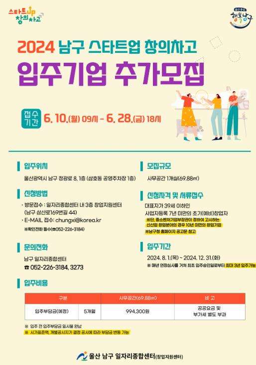 ▲ 울산 남구, ‘2024년 남구 스타트업 창의차고’ 입주기업 모집 |