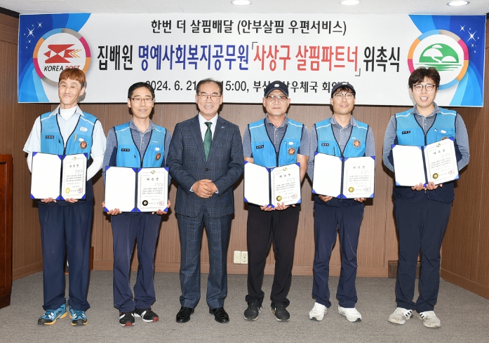 [뉴스서울] 부산 사상구는 지난 21일 ‘한번 더 살핌배달’에 참여하는 부산사상우체국 소속 집배원 44명을 명예사회복지공무원으로 위촉했다고 밝혔다.