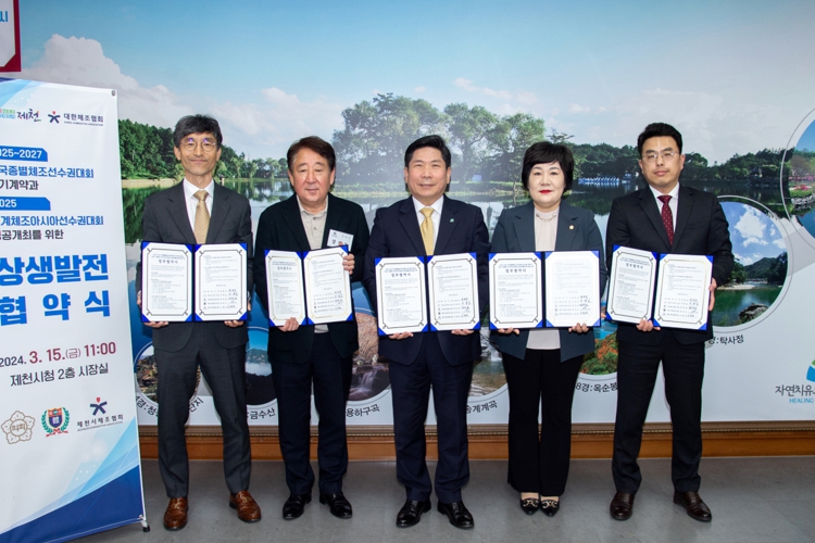 지난 15일 제천시청에서 김창규 제천시장과 대한체조협회 장재돈 부회장, 이정임 제천시의회 의장, 안성국 제천시체육회장, 오재성 제천시체조협회장이 참석한 가운데 상생발전 협약식이 개최 됐다.