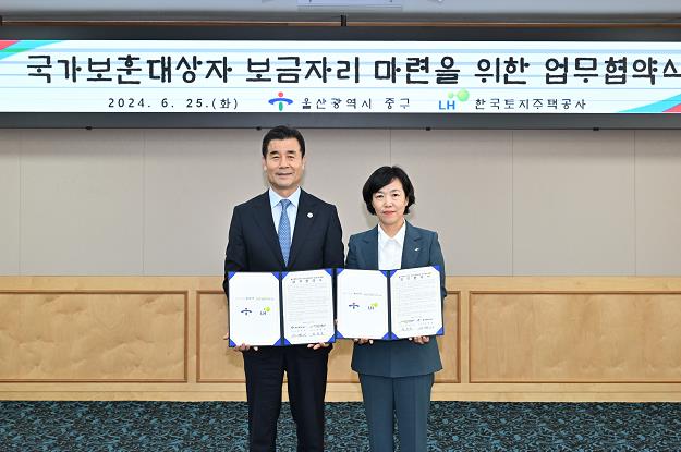 [뉴스서울] 울산 중구와 한국토지주택공사(LH) 부산울산지역본부가 6월 25일 오후 2시 15분 중구청 2층 중회의실에서 전국 최초로 ‘무주택 국가보훈대상자의 보금자리 마련을 위한 업무협약’을 맺었다.