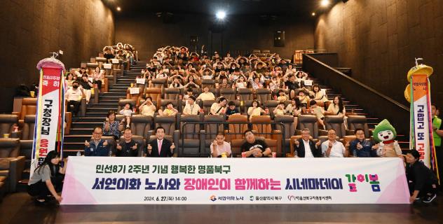 이날 메아리동산, 메아리보람의터, 아나율 및 어울림보호작업장, 울산지적발달장애인복지협회 북구지부 등 5개 장애인시설 장애인과 활동보조인 등 100여 명이 영화를 관람하며 즐거운 시간을 보냈다.
