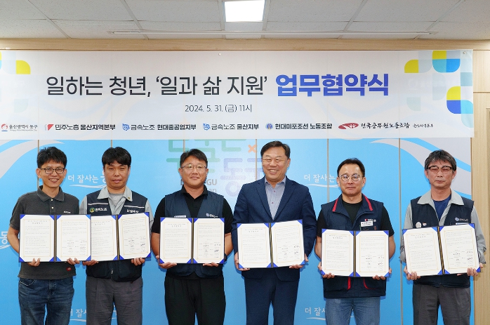 이날 협약식에는 김종훈 동구청장을 비롯해 ‘일하는 청년, 일과 삶 지원 업무협약’에 참여한 5개 노동조합(민주노총 울산지역본부, 금속노조 현대중공업지부, 금속노조 울산지부, 현대미포조선 노동조합, 공무원노조 울산 동구지부) 대표자 및 관계자 10여명이 참석했다.