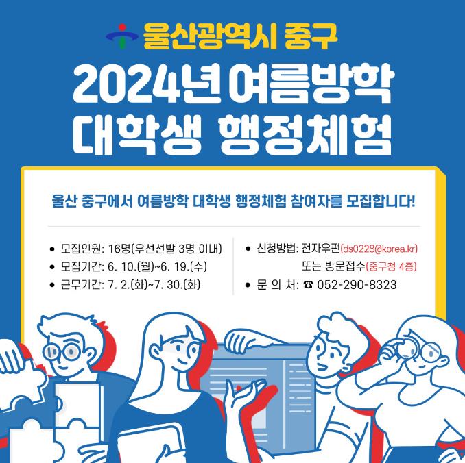 [뉴스서울] 울산 중구가 ‘2024년 여름방학 대학생 행정체험’ 참여자를 모집한다.