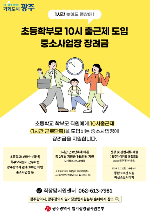 성유석 일가정양립지원본부장은 “광주시가 지난해부터 전국 최초로 시행한 초등학부모 10시 출근제는 타 지자체에서 벤치마킹할 정도로 관심있는 사업으로 시민들의 호응도 크다”며 “특히 전 학년으로 확대 시행하게 돼 더 촘촘한 지원이 가능해진 만큼 학부모와 사업장의 많은 관심 부탁드린다”고 말했다.