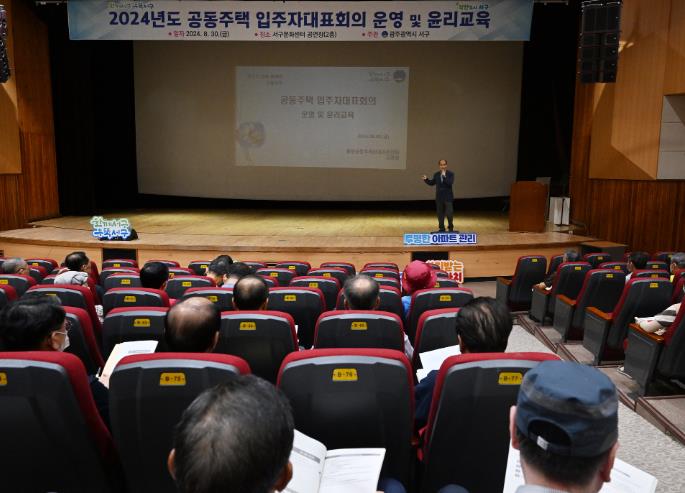 [뉴스서울] 광주광역시 서구는 30일 서구문화센터 2층에서 관내 의무관리대상 공동주택 입주자대표회의 구성원들을 대상으로 ‘2024년도 공동주택 입주자대표회의 운영 및 윤리교육’을 운영했다.