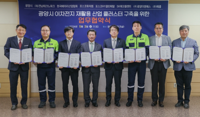 협약식에는 정인화 광양시장, 전남테크노파크 오익현 원장, 한국배터리산업협회 최종서 본부장, 포스코퓨처엠 한동수 광양양극재 생산부장, 포스코HY클린메탈 임지우 대표, SK에코플랜트 마상복 부사장, ㈜광양이엔에스 김학범 대표, ㈜에콤 고대권 대표가 참석했다.