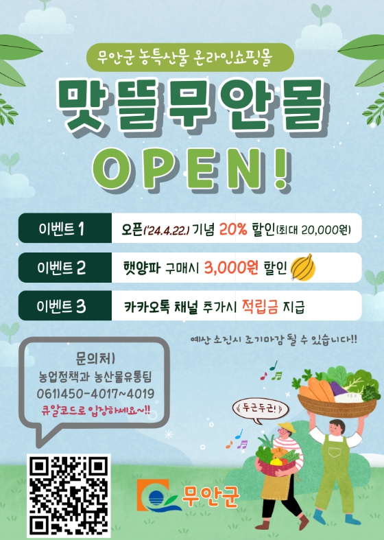김산 군수는 “맛뜰무안몰 개장을 통해 온라인 직거래가 활성화되어 농가와 소비자 모두 상생할 수 있는 플랫폼을 만드는 데 최선을 다할 것”이며 “우리 지역 먹거리를 소비자에게 더욱 다양한 혜택으로 제공하기 위해 시기별 프로모션을 추진하는 등 지원을 아끼지 않겠다”고 말했다.