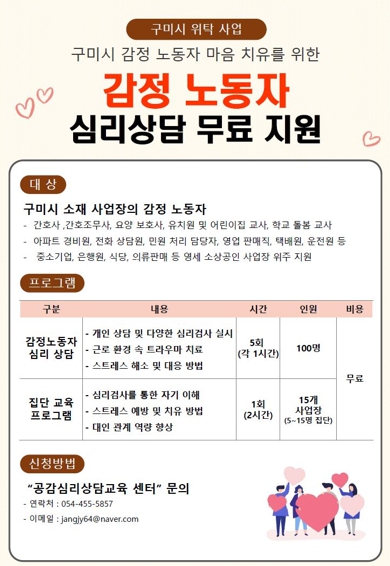 신청 대상은 △주민등록상 구미시 거주자 △간호사, 물리치료사, 콜센터, 사회복지사, 요양보호사, 택시기사, 안내 도우미, 유치원 교사, 경비원 등 감정노동 직군에 종사하고 있는 근로자 또는 사업장이다.