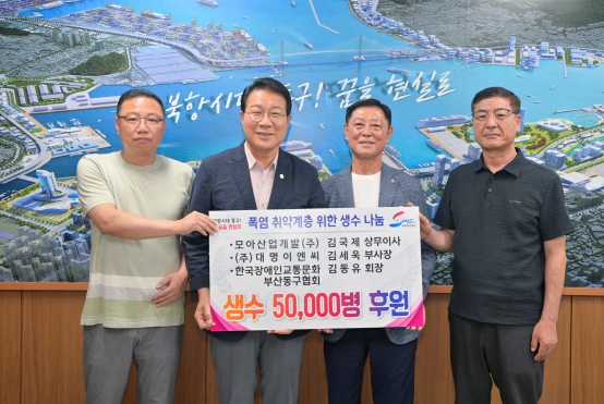 [뉴스서울] 부산광역시 동구는 지난 6일 후원자들로부터 여름철 폭염취약계층의 온열질환 예방을 위한 생수 500㎖ 50,000병을 후원 받았다고 밝혔다.