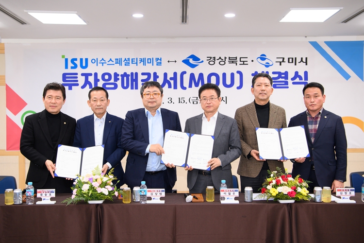 [뉴스서울] 구미시는 15일 시청에서 이철우 경북도지사와 김장호 구미시장, 김상범 이수그룹 회장, 류승호 이수스페셜티케미컬 대표 등이 참석한 가운데 구미국가산업단지 내 공장 신설을 위한 투자양해각서(MOU)를 체결했다.