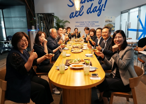 | ▲ 최기문 영천시장(오른쪽 세 번째), 강구석 대구은행 영천시청지점장(오른쪽 두 번째), 이구권 신녕농협 조합장(왼쪽 세 번째), 이구형 영천시체육회 부회장(왼쪽 네 번째) 등이 피자알볼로 스타코점에서 열린 영천마늘불고기피자 시식행사에 참석했다. |
