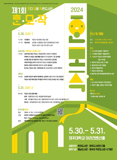 [뉴스서울] 제주특별자치도 한라도서관은 전국의 작은도서관및 동아리 활동가들과 ‘혼디 모영 작은도서관’이라는 주제로 30~31일 제주대학교 아라컨벤션홀에서 'ᄒᆞᆫ·모·작'행사를 연다.