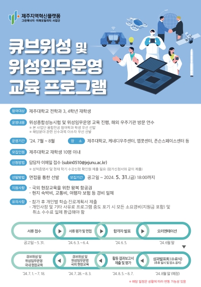 제주지역혁신플랫폼 그린에너지·미래오빌리티사업단은 제주대학교 전 학과 3, 4학년 재학생을 대상으로 ‘큐브위성 및 위성임무운영 교육 프로그램을 연다.