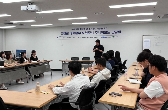 이날 간담회에는 영주시 주니어보드(Y-주니어보드) 20명과 코레일 경북본부 주니어보드(코드네임 신세계) 18명이 참석해 지역경제 활성화와 조직문화개선 방안을 논의하고, 협력사업 발굴·추진을 위한 의견을 공유했다.