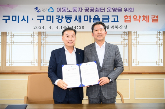 [뉴스서울] 구미시는 4일 시청에서 구미강동새마을금고와 이동 노동자들의 접근성과 편의성을 높이고, 편안한 휴식 공간을 제공하기 위해‘休마루’이동 노동자 공공 쉼터 운영을 위한 업무협약(MOU)을 체결했다.