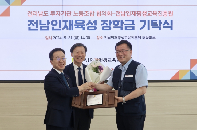 [뉴스서울] 전라남도 투자기관 노동조합 협의회가 5월 31일 전남인재평생교육진흥원에 전남 인재육성 장학금 1천만 원을 기탁했다.