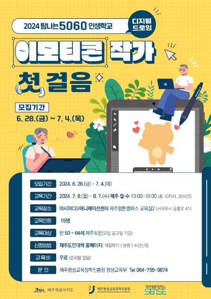[뉴스서울] 제주평생교육장학진흥원(원장 고승한)은 제주도내 장년층(50~64세)을 대상으로 탐나는 5060 인생학교 집중탐구과정인‘디지털 드로잉, 이모티콘 작가 첫 걸음’ 교육생을 모집한다.