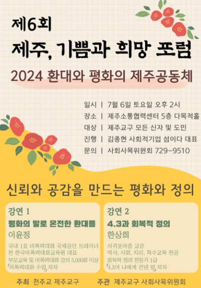 [뉴스서울] 천주교 제주교구가 지난 2022년부터 제주 지역의 인권과 평화, 생태, 환경 등 제주 현실에 관심을 갖고 참여하는 교회로 거듭나기 위해 시작한 ‘제주 기쁨과 희망 포럼’의 여섯 번째 포럼 행사를 마련합니다.