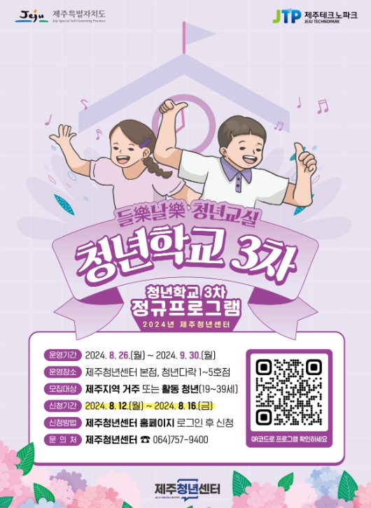 [뉴스서울] 제주특별자치도와 제주청년센터(제주TP산하)가 8월 12일 부터8월 16일까지 제주청년학교 3차 정규프로그램 참여자를 모집한다.