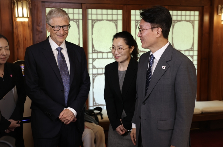 ▲ 김민석 국무총리가 21일 삼청동 총리서울공관에서 빌 게이츠 게이츠재단 이사장을 접견, 인사 및 환담을 나누고 있다. |