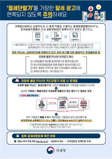 아울러, 국세청은 금융감독원과 미등록 혐의 결제대행업체 정보 공유, 실무협의 등 긴밀한 공조체제를 유지하면서 불법행위에 공동 대처하고 있다.