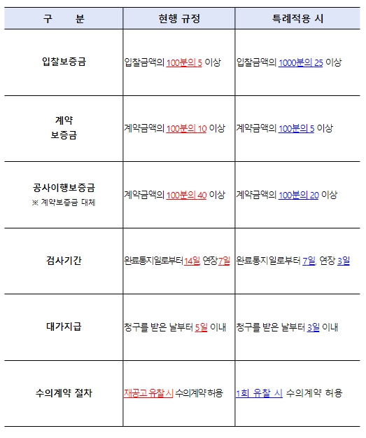 지방계약 한시적 특례의 주요 내용은 ①각종 보증금의 50% 인하, ②검사 기간 등 단축, ③수의계약 절차 간소화로 구체적인 내용은 다음과 같다.