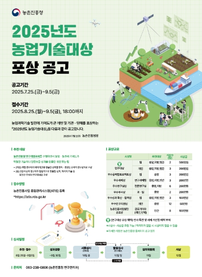 [뉴스서울] 농촌진흥청은 농업과학기술 발전에 크게 기여한 개인 또는 기관・단체를 포상하는 ‘2025년도 농업기술대상’ 후보자 추천을 공모한다.