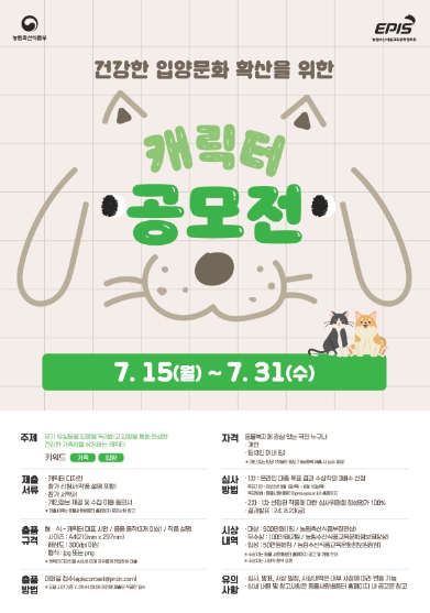 [뉴스서울] 농림축산식품부는 유기·유실 동물에 대한 인식개선 및 입양 활성화를 위한 ‘캐릭터 공모전’을 7월 31일까지 개최한다.