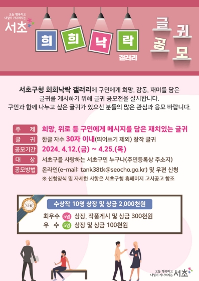 전성수 서초구청장은 “'희희낙락 갤러리'를 통해 서초구청을 방문하는 모든 구민이 잠시나마 일상의 위로와 즐거움을 얻을 수 있길 바라며, 이번 글귀 공모와 같이 다양한 방법으로 구민과 소통해 나가겠다”고 말했다.