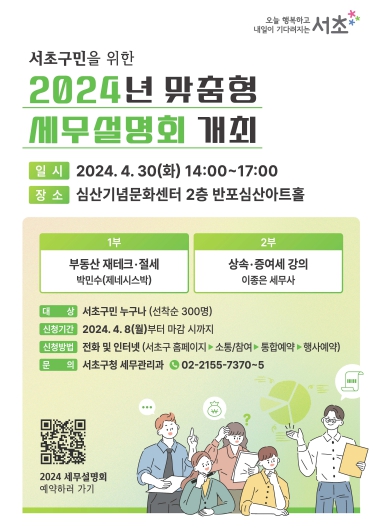 [뉴스서울] 서울 서초구는 복잡한 세제정책 및 변화에 대한 구민들의 이해를 높이고 궁금증 해소를 위해 ‘2024년 맞춤형 세무설명회’를 개최한다.
