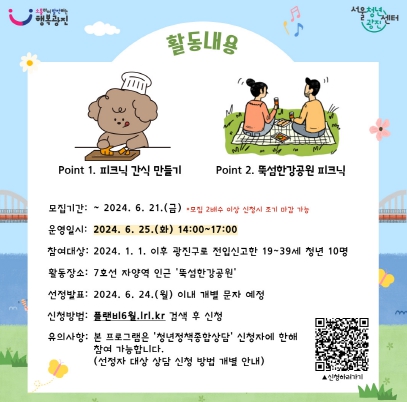 프로그램은 오는 25일, 뚝섬한강공원에서 진행된다. 동네 친구를 만들 수 있는청년 네트워킹 활동을 비롯해 피크닉 간식 만들기, 국제정원박람회 관람, 뚝섬한강공원 피크닉 등 전입 청년의 광진구 적응을 위한 다양한 소통 활동으로 구성된다.