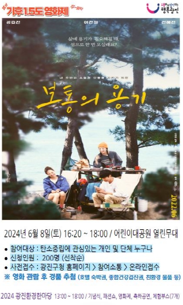 또한, 기후 1.5도 영화제는 일주일간의 탄소 제로 프로젝트를 주제로 한 다큐멘터리 영화 ‘보통의 용기’를 상영한다. 사전 접수로 200명을 모집하며, 환경에 관심 있는 구민 누구나 광진구청 누리집에서 신청할 수 있다. 관람 후에는 호텔 숙박권, 종합건강검진권 등 풍성한 경품 이벤트도 준비되어 있다.