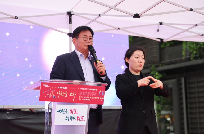 ▲ 박강수 마포구청장이 ‘사람을 보라’ 축제에서 기념사를 전하고 있다. |