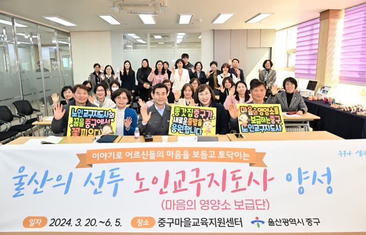 김영길 중구청장은 “울산에서 최초로 시행하는 노인교구지도사 양성은 초고령화 시대 흐름에 발맞춰가는 꼭 필요한 사업으로, 신중년에게는 사회공헌 활동과 새로운 일자리를 창출하고, 지역 어르신에게는 심신의 건강과 삶의 활력소를 제공할 것으로 기대한다”며 “앞으로도 우리 중구가 ‘사회적 효’를 실천하고 신중년과 어르신을 위한 다양한 정책들을 펼쳐 나갈 수 있도록 적극 노력하겠다”고 전했다.