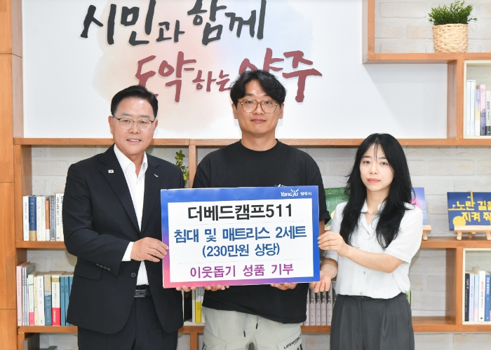 강수현 양주시장은 “뜻깊은 성품을 기부해 주신 ‘더베드캠프511’ 대표님과 임직원분들께 진심으로 감사드린다”며 “대표님의 마음이 담긴 소중한 성품을 가장 필요한 분들께 전달될 수 있도록 최선을 다하겠다”고 전했다.